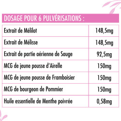 • Synergy of 7 organic plants harvested in France: sage, cranberry, raspberry, sweet clover, lemon balm, apple buds, and peppermint.