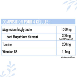 Bisglicinato de magnesio, taurina, antiaglomerante sales de magnesio de ácidos grasos, vitamina B6 clorhidrato de piridoxina, cápsula vegetal hidroxipropilmetilcelulosa.