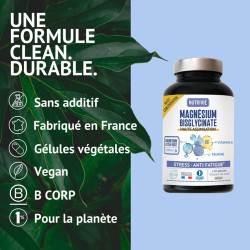 Diseñado para favorecer tu equilibrio físico y mental, el Magnesio Bisglicinato de Nutrivie actúa en profundidad sobre el cansancio, el estrés y el sueño. Gracias a su forma bisglicinato, se absorbe mejor que las formas clásicas de magnesio y es altamente tolerado por el sistema digestivo. Enriquecido con vitamina B6 y taurina, optimiza la absorción del magnesio y contribuye al buen funcionamiento del sistema nervioso y muscular.
