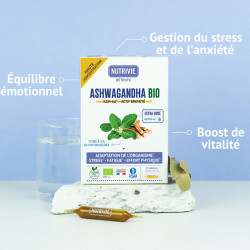 Eau adoucie, extrait sec de racine d'Ashwagandha (Withania somnifera)*, acidifiant: acide citrique, agent texturant : gomme xanthane