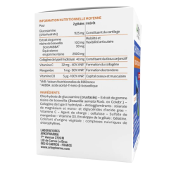 Chlorhydrate de glucosamine (crustacés) – Extrait de gomme résine de boswellia (Boswellia serrata Roxb. ex Colebr.) – Agent de charge : cellulose – Collagène de type II hydrolysé – Vitamine C – Antiagglomérants : stéarate de magnésium et mono et diglycérides d’acide gras – Sulfate de manganèse – Vitamine D3.